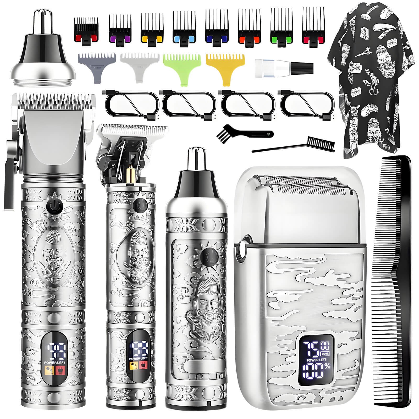 Hair Clippers for Men, Professional Beard Trimmer, Cordless Electric Nose Shaver Set of 4 for Men, Silver